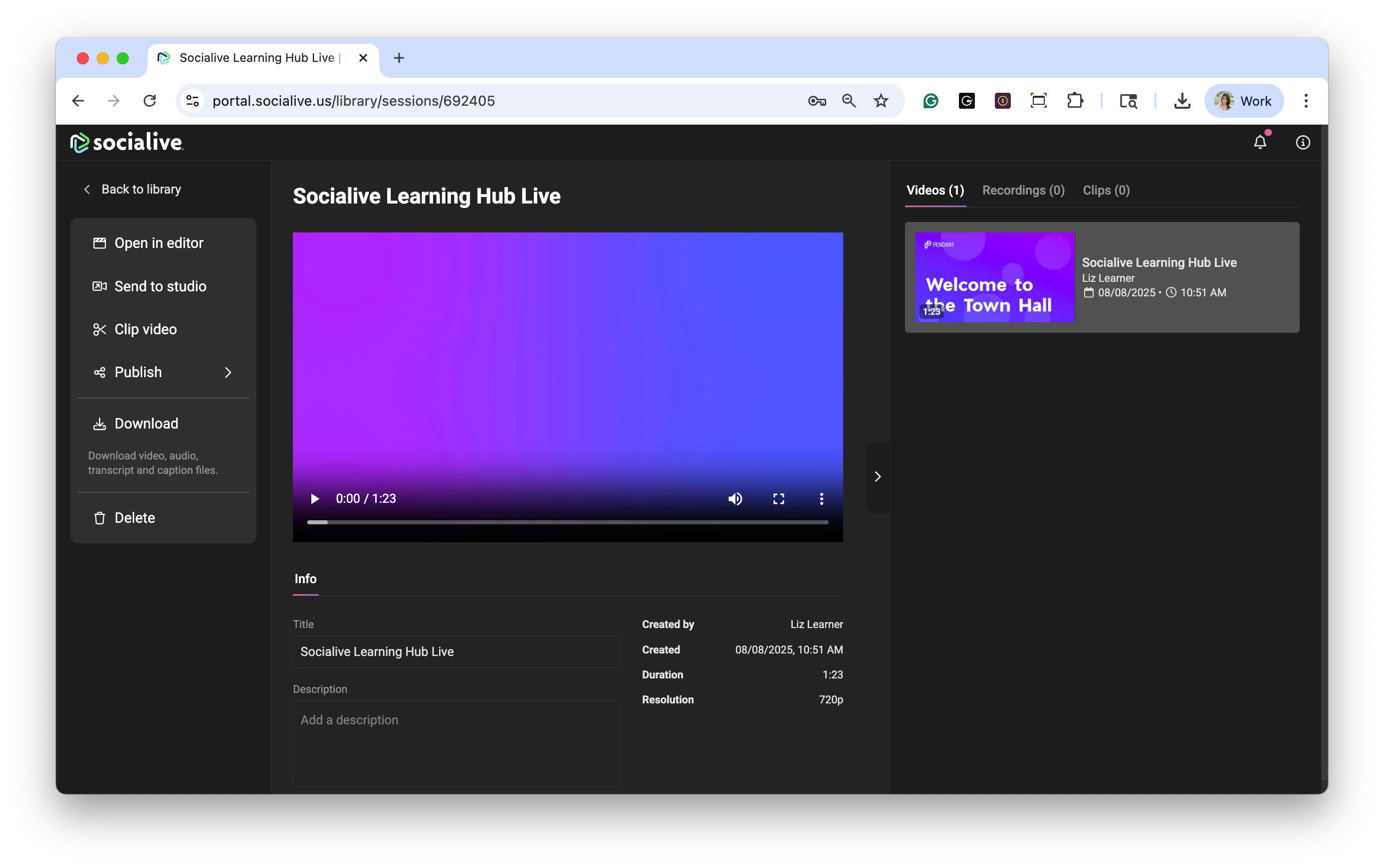 From the videos tab in the Library, select the recording to be edited - this can be a video from a Studio recording, an individual ISO, or a video uploaded to the library (including screen share videos)