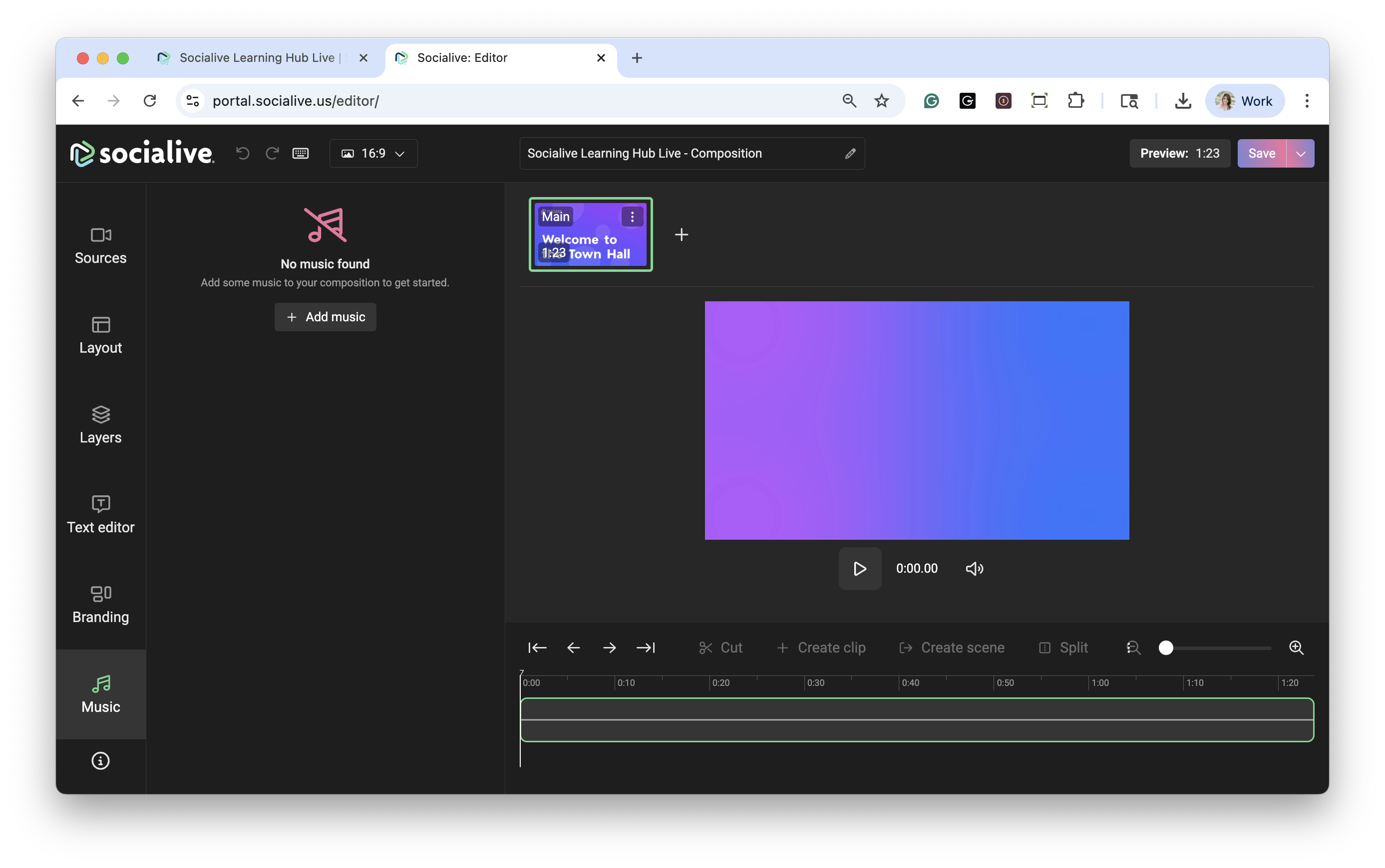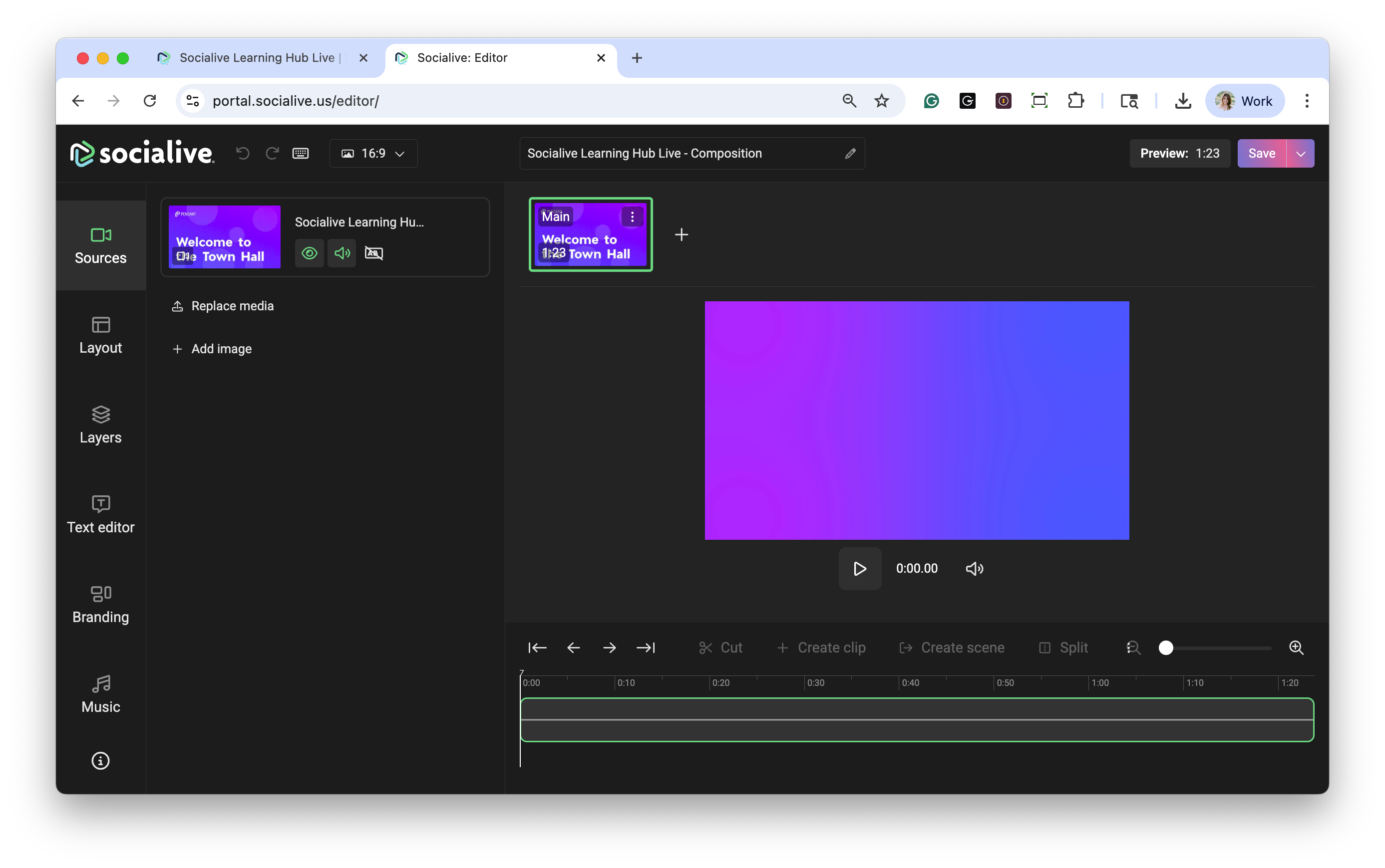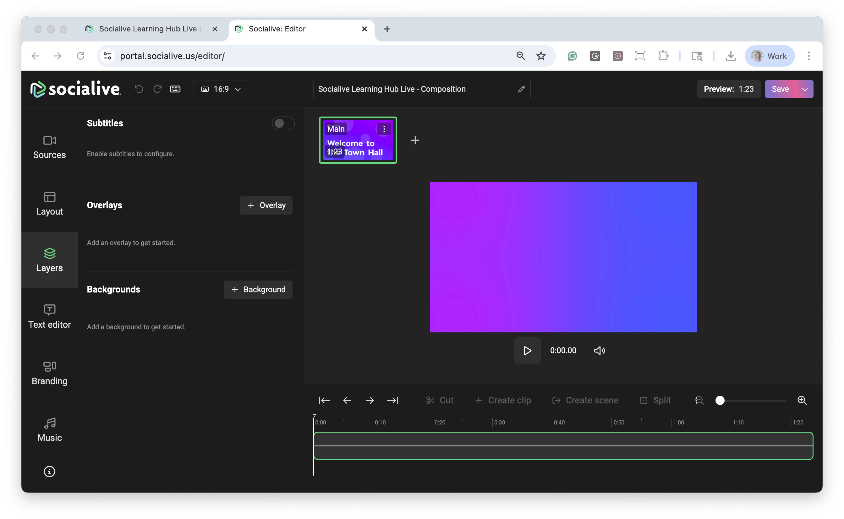 The Editor is the interface where Admins, Producers, and Creators can take recorded content edit it. Creating a high-quality video with graphics, branding, nametags, and logos is easy and quick with the Socialive Editor.