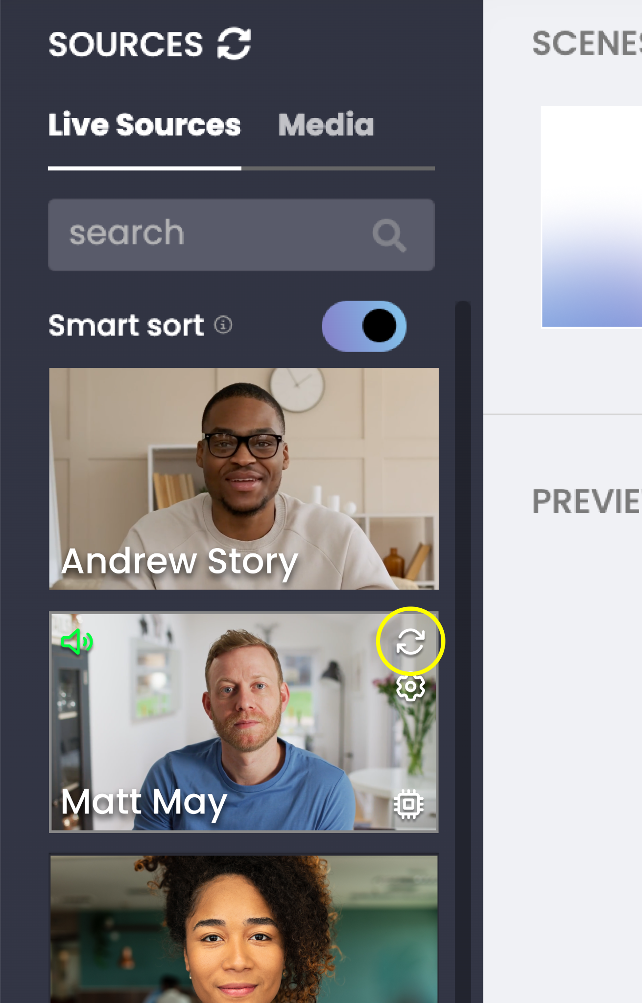 In Socialive Studio, a host, producer, or admin can reload individual guest streams within the live sources area. This can be useful if the guest has video quality issues during a recording or livestream.