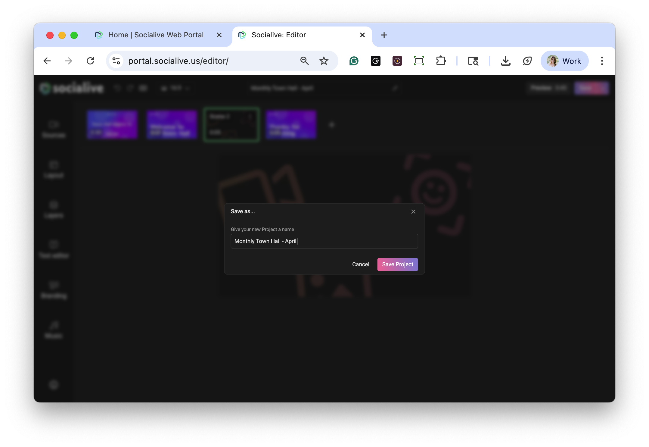 Edit your project within the Socialive Editor. You can pause your work at any time and return to the project, or collaborate on it with a colleague.